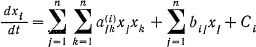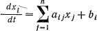 где xi — концентрация i-го вещества, aij обозначает влияние вещества j на скорость изменения вещества i. Это влияние является усиливающим, если aij положительно, и ослабляющим, если aij отрицательно. Постоянная bi обозначает приток извне i-го вещества (если она положительна) или его отток (если она отрицательна).