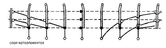 Это можно сделать несколькими способами. Можно предусмотреть механическую вертикальную регулировку фотоэлементов. С другой стороны, можно взять достаточно большой вертикальный ряд фотоэлементов и менять распределение нот соответственно размеру шрифта, оставляя фотоэлементы, расположенные выше и ниже шрифта, немыми. Для этого можно, например, воспользоваться схемой с двумя комплектами соединительных линий. В этой схеме входные линии отходят от фотоэлементов и ведут к цепочке переключателей, все более и более расходясь в стороны, а выходами служат вертикальные линия, как на рис. 8. Здесь одиночные линии – провода от фотоэлементов, двойные линии – провода к генераторам звука, кружки на пунктирных линиях – точки соединения входных и выходных, проводов, а сами пунктирные линии – провода, управляющие включением того или иного генератора. Это и есть упомянутое во введении устройство, которое спроектировал Мак-Каллох для регулировки своего аппарата по высоте шрифта. В первом варианте выбор пунктирных линий производился вручную.