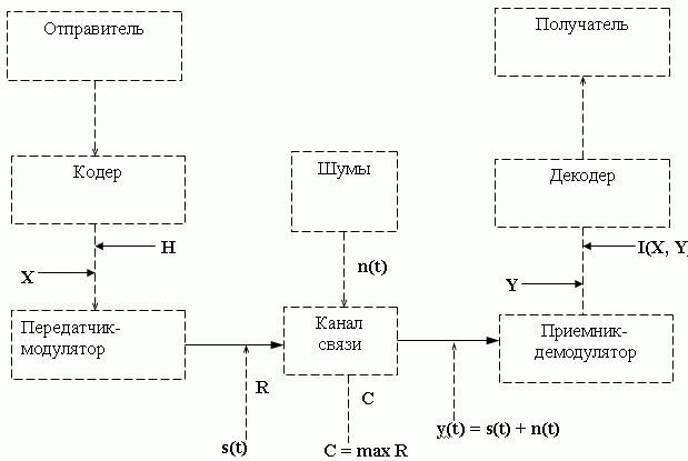 Для напоминания об основных понятиях теории информации приведем вариант блок-схемы системы передачи информации. На этом рисунке приведено большинство введенных в данной главе понятий и обозначений.